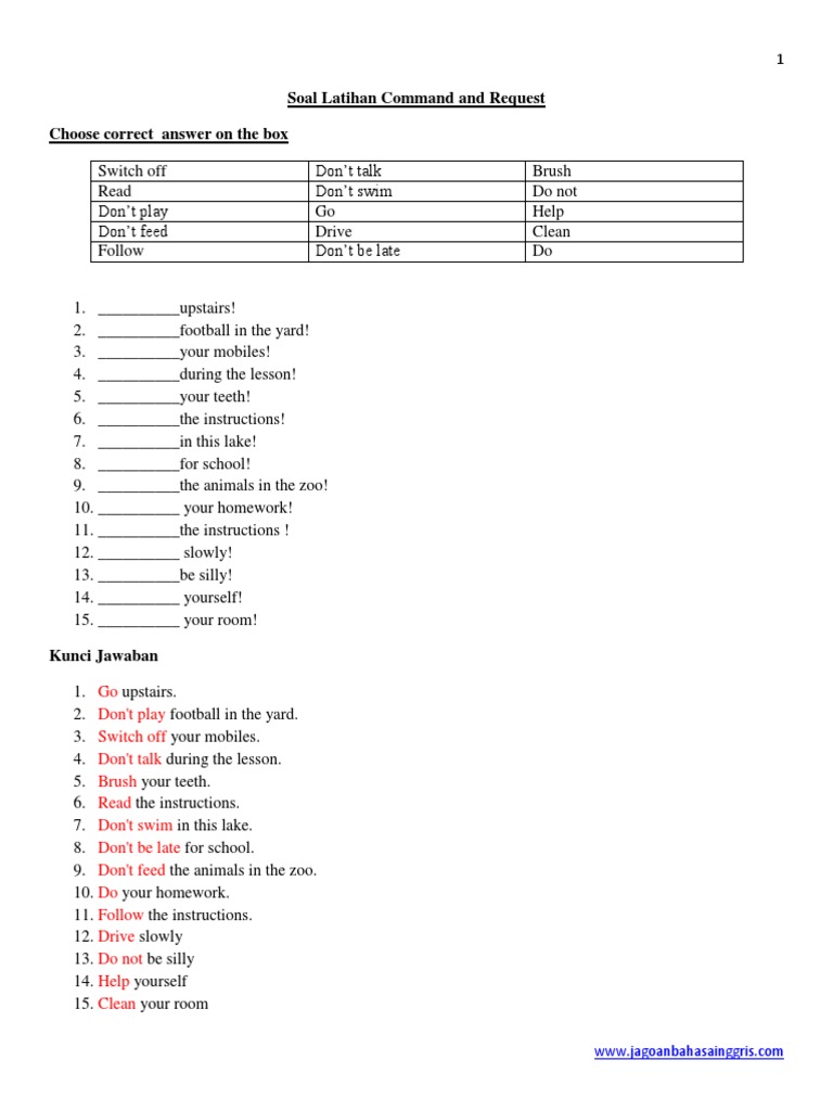 Sahabat SBI pasti sudah tidak asing lagi bukan dengan kata tersebut. Polite request merupakan suatu bentuk pertanyaan santun untuk meminta izin atau pertolongan. 1 Soal Latihan Command and Request Choose correct answer on the box Switch off Read Dont play Dont feed Follow Dont talk Dont swim Go Drive Dont be late Brush Do not Help Clean Do 1.